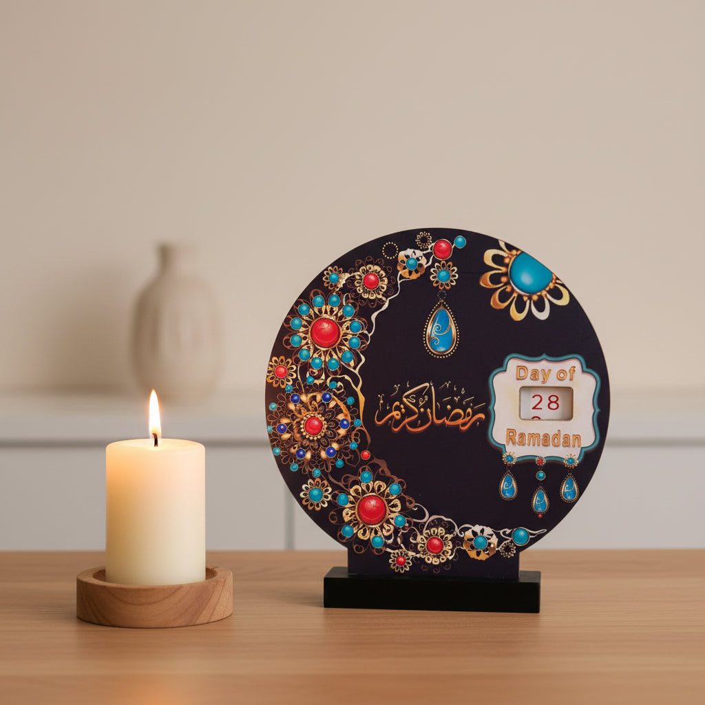 Black With Teal Floral Design Round Shape Wooden Ramadan Countdown Calendar Stand