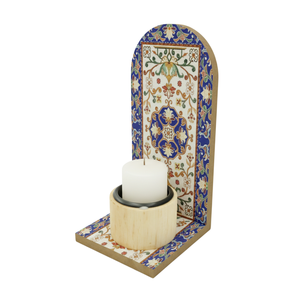 Blue Ottoman Print Wooden Minaret Candle/Bakhoor Stand For Eid & Ramadan