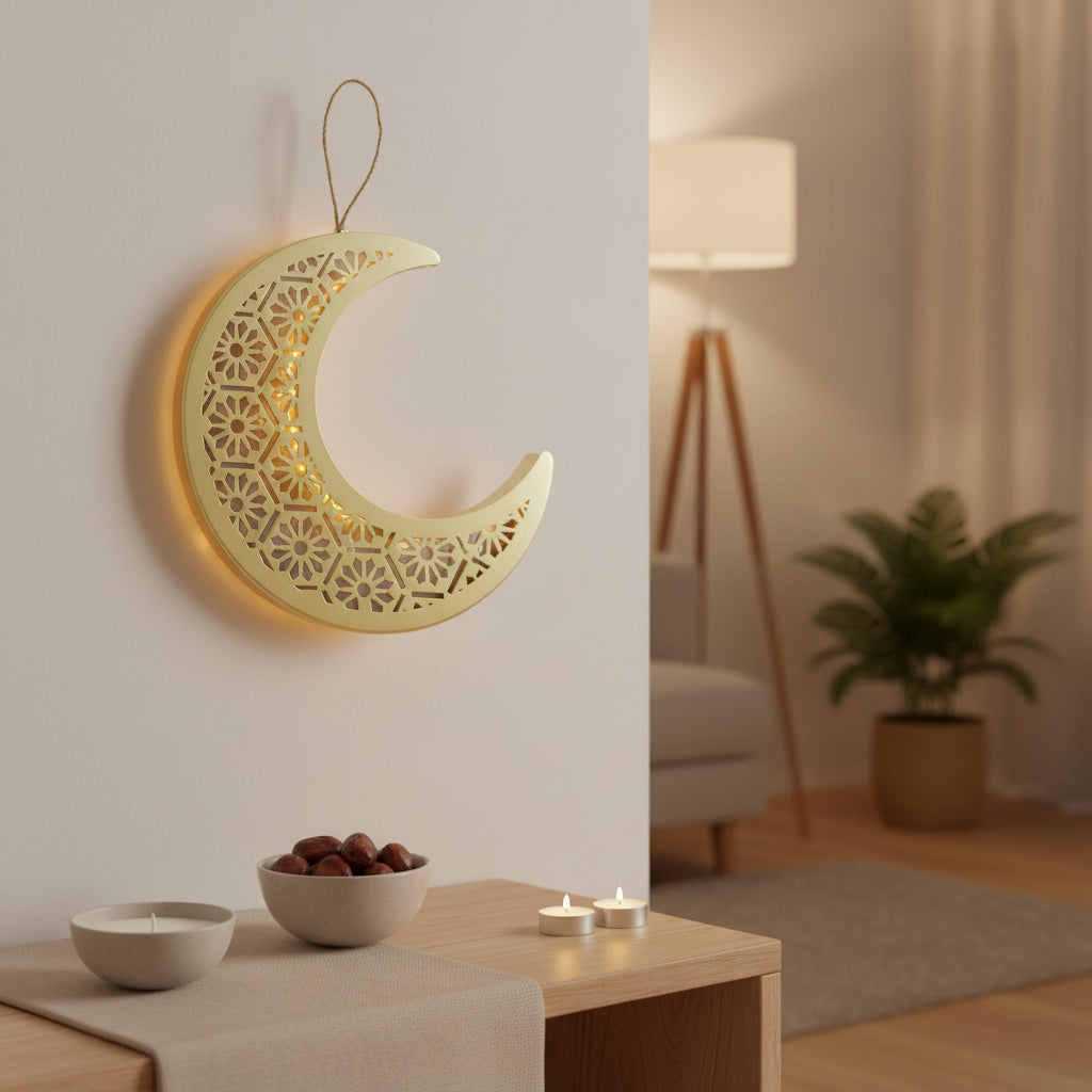 Geometric XL Gold Wooden Hanging LED Light Crescent Moon