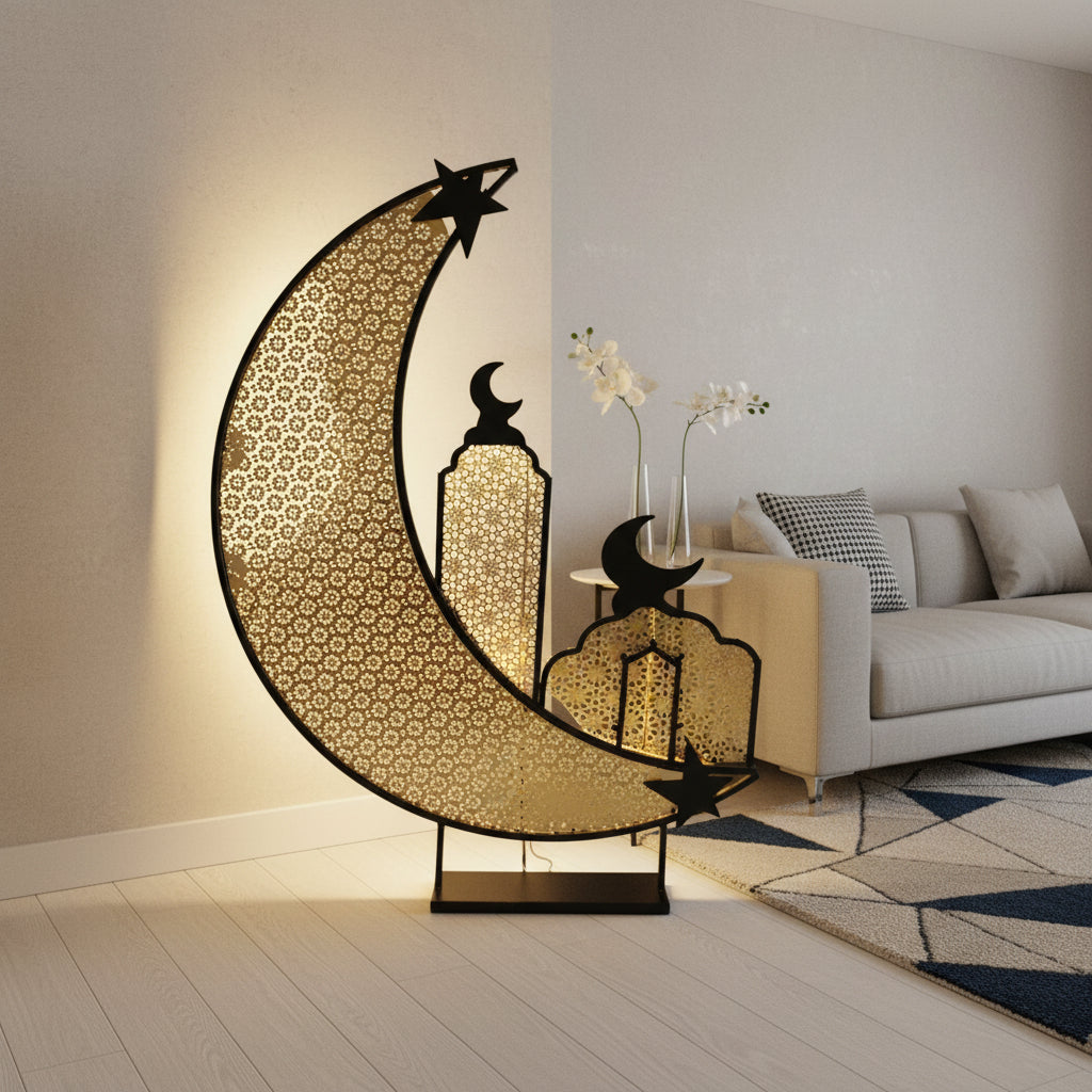Giant Gold & White Metal Crescent Moon With Mosque