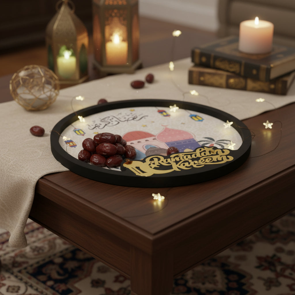 Gold Shiny Ramadan Kareem Round Colourful Mosque Design Wood Tray For Ramadan & Eid