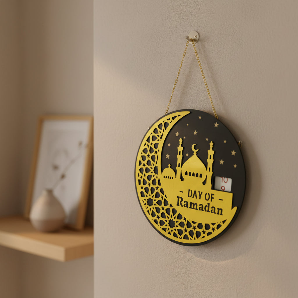 Large Metallic Gold & Black Round Shape Wooden Ramadan Countdown Calendar Hanging