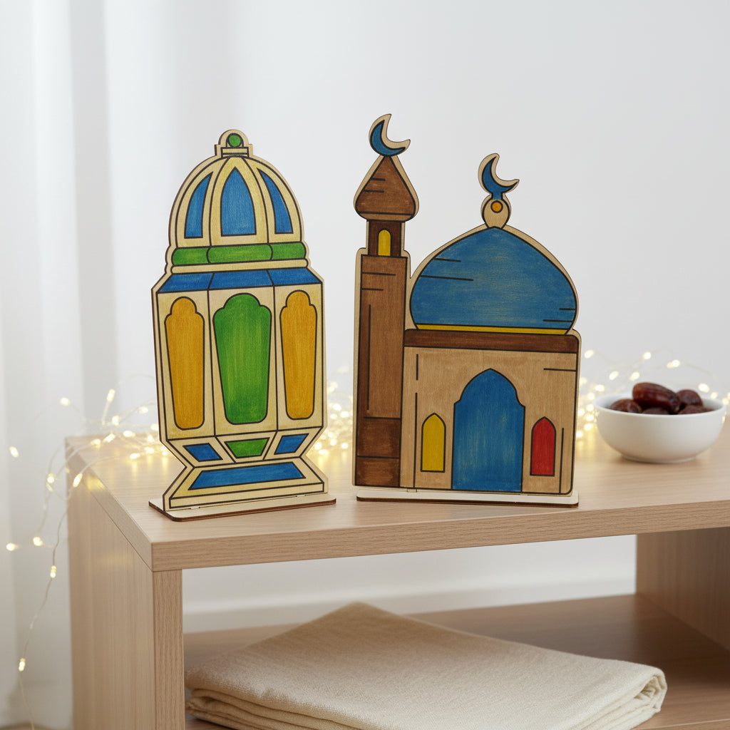 Pack of 2 Kids Colouring Wooden Mosque and Lantern Craft Set with Markers