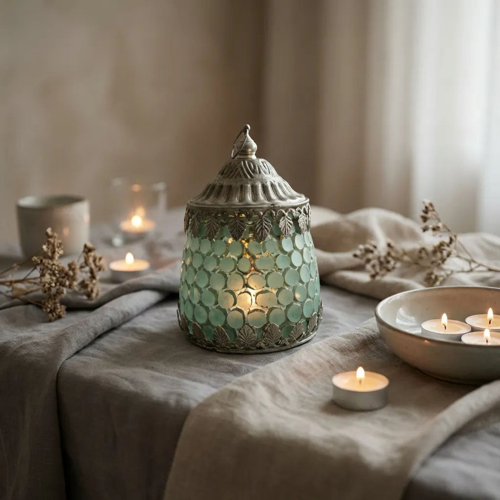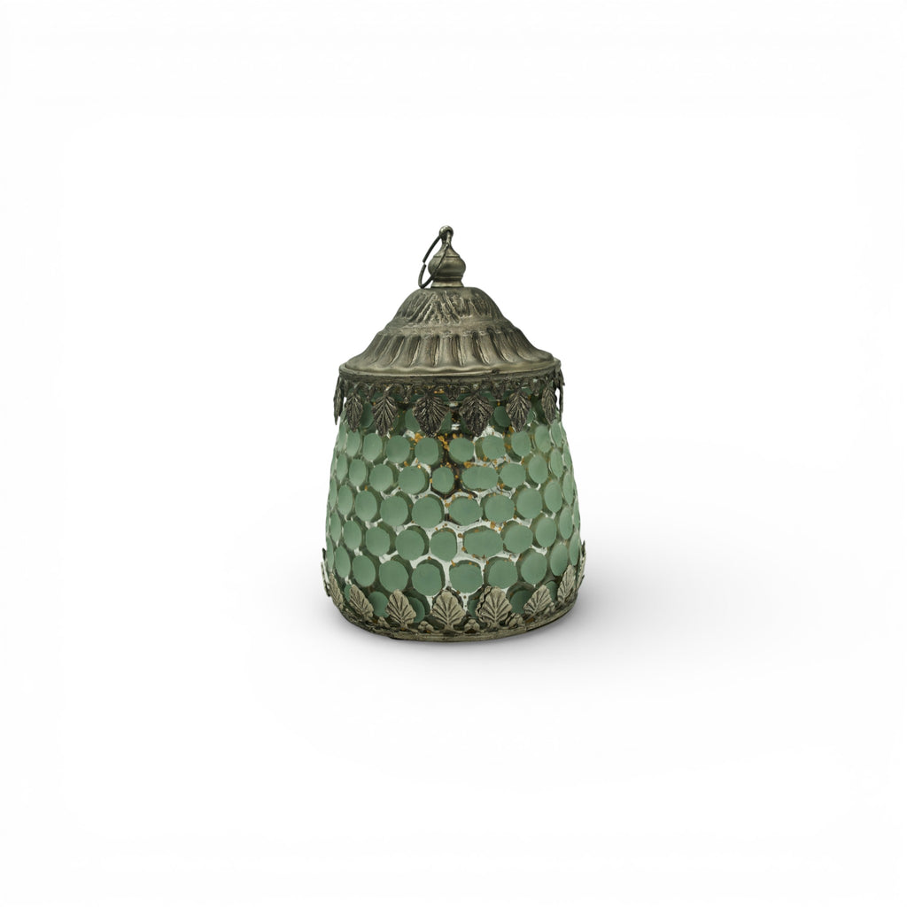 Pale Mint Hexagon Pattern Glass LED Lantern For Ramadan & Eid