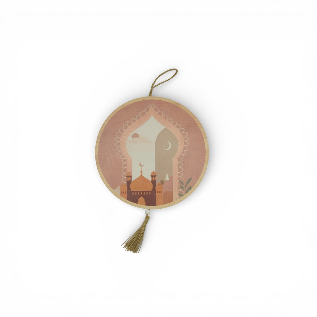 Round Wooden Hanging Sign with Minaret Design & Tassels