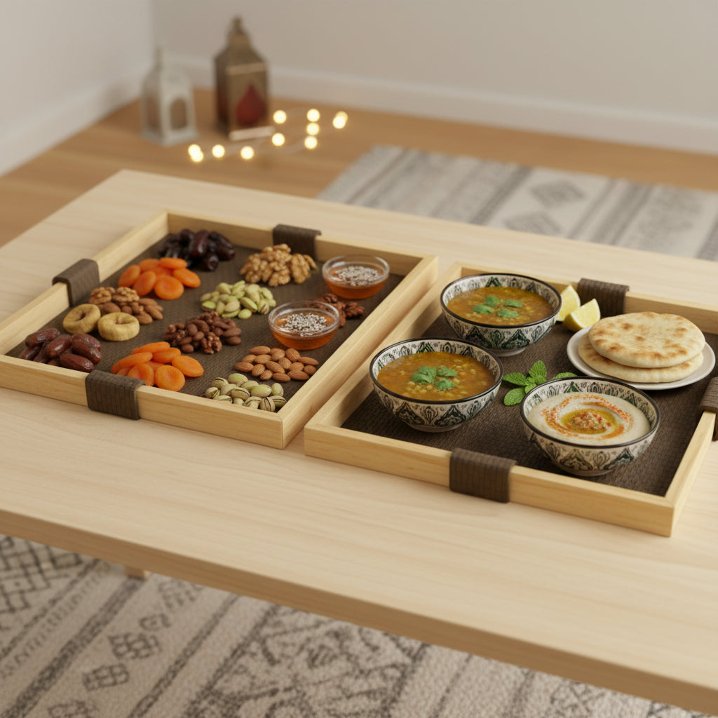 Set of 2 Natural Wood Rectangular Serving Trays with Faux Leather Base & Handles(JZ2405)