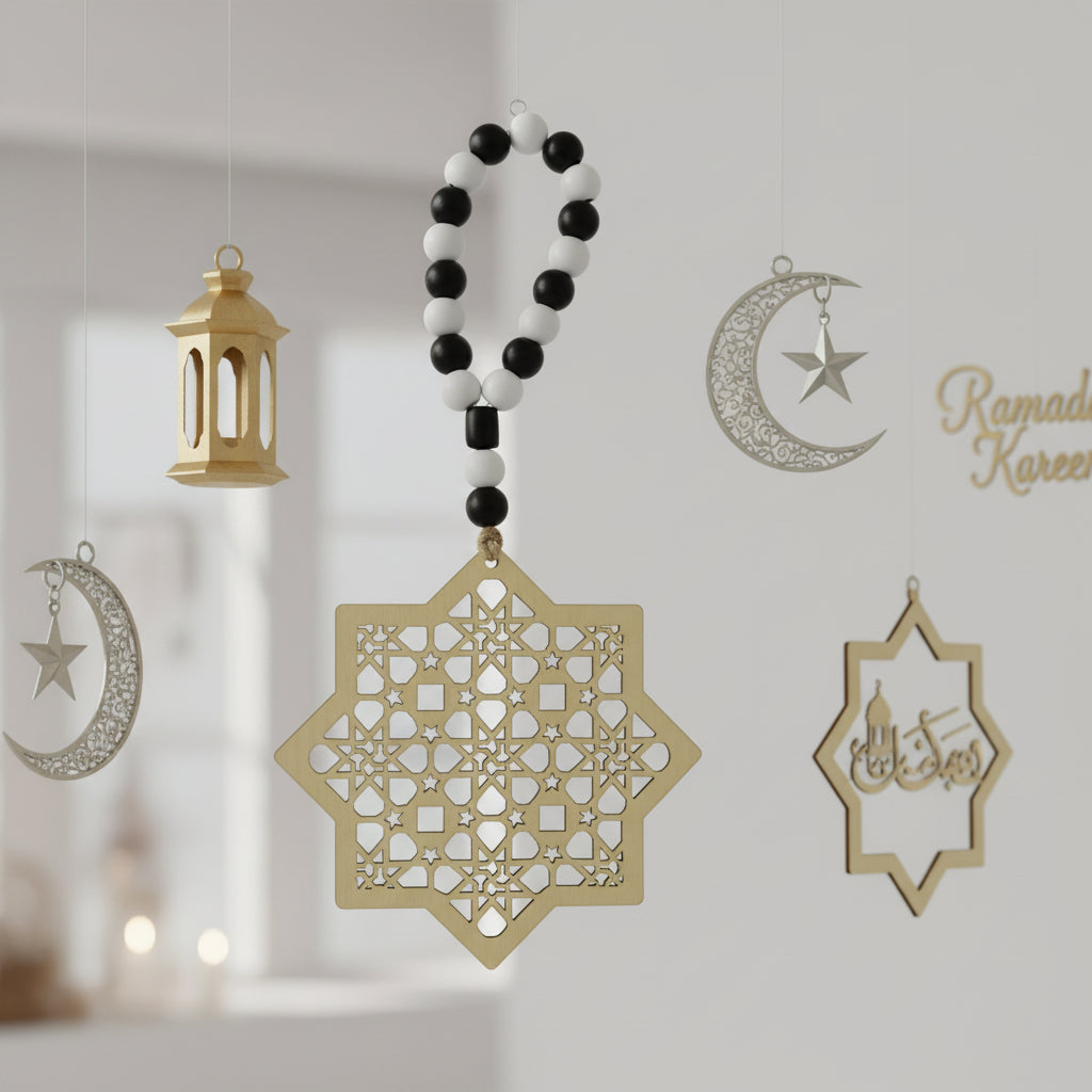 Wooden Ornate Gold Star With Wooden Bead Hanging